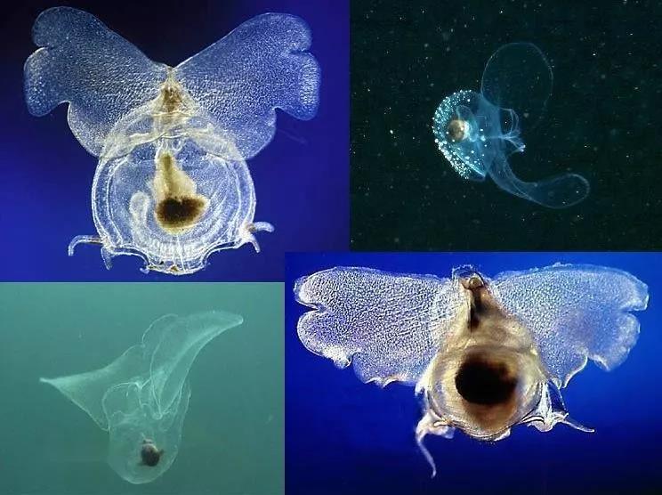 与海苹果一样,海蝴蝶也不是真正的蝴蝶,而是一种浮游生物。它们的学名叫“翼足螺”,与蜗牛是“亲戚”。每个海蝴蝶拥有一对形似双翼的侧足——翼状瓣。它们利用翼状瓣在海中游动,并通过翼状瓣上方布满黏液的网捕猎。
